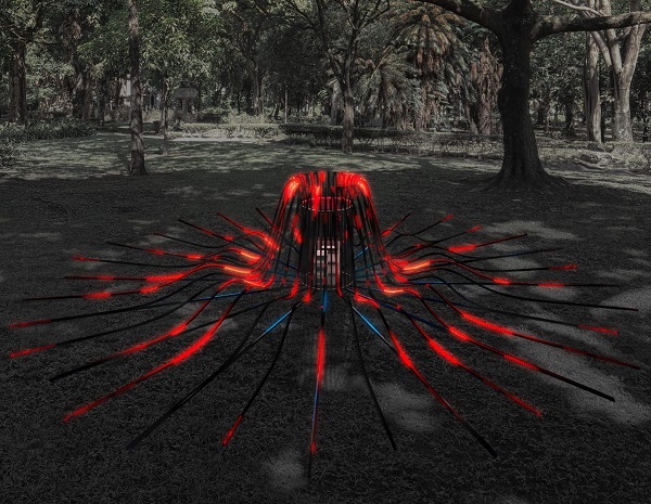Leandro Lima montará Artéria, instalação luminosa a partir de uma estrutura metálica central. Dali, saem fitas de LED programáveis, formando uma peça de aproximadamente um metro de altura por seis a sete metros de diâmetro. A animação de luz pulsa em tons de vermelho e azul, estabelecendo um diálogo entre o ambiente natural e o artificial, evocando a manifestação da natureza e representando o pulsar do planeta.