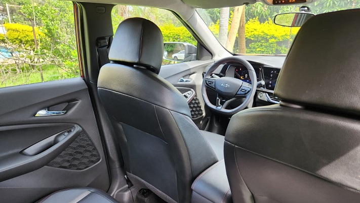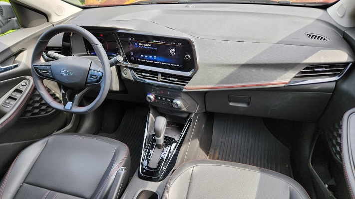 O interior da versão RS Turbo concentra os principais diferenciais da linha. O painel de instrumentos digital de 8 polegadas e a central multimídia MyLink de 11 polegadas formam o conceito de cockpit virtual da Chevrolet, com interface direta e rápida. A câmera de ré digital de alta resolução facilitou manobras em ambientes urbanos, enquanto os bancos, o volante e os comandos apresentaram ergonomia adequada ao uso diário.