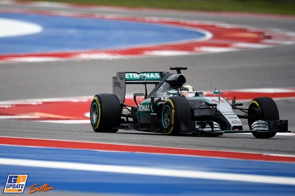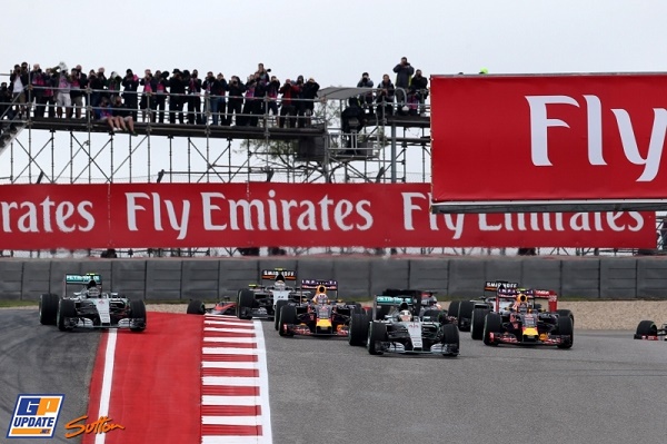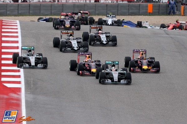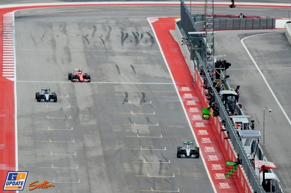 Com pista molhada, mas sem chuva, os carros deram a largada e Hamilton, na primeira curva, mostrou que estava a fim de ser campeão na terra do Tio Sam e deu um chega pra lá em Rosberg. O alemão não ficou nada contente, pois caiu para a quinta colocação.