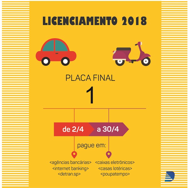 Atenção: começou a corrida para o licenciamento do seu veículo! O Departamento Estadual de Trânsito de São Paulo (Detran.SP) alerta que neste mês de abril tem início o calendário obrigatório de licenciamento 2018 para os veículos registrados no Estado. A partir de agora, a cada mês um final de placa deve ser licenciado para circular. Em abril, são os donos dos automóveis com placa terminada em 1 que devem regularizar a documentação até o dia 30/4.