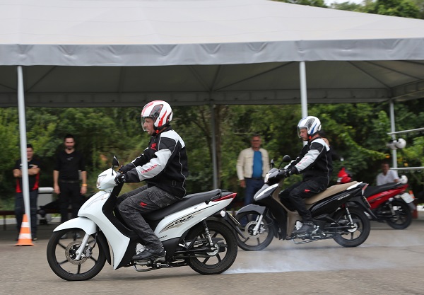 Para conhecer melhor essa motoquinha que já faz parte do cenário brasileiro, fiz um teste em duas fases: primeiro dentro da área do CETH da Honda em Indaiatuba (SP) e depois nas ruas da cidade. Pude rodar nas duas versões: 110 e 125cc, ambas com freios CBS, mas a Biz 110i é oferecida apenas com freio dianteiro a tambor. Sim, você poderia se perguntar “mas por que ainda se faz motos com freio a tambor em pleno século 21?”. E a resposta é a mais prosaica possível: porque em pleno século 21 ainda tem gente que morre de medo de usar moto com freio a disco na dianteira!