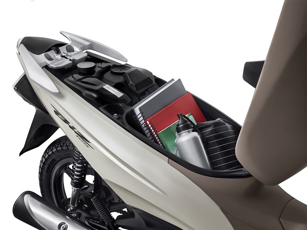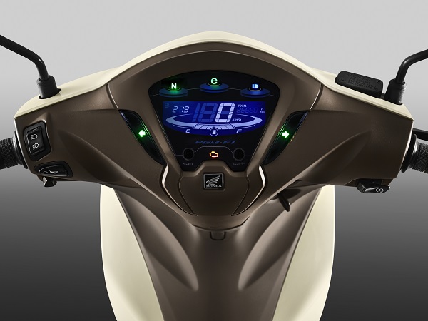 O primeiro impacto positivo é no novo conjunto ótico, com lanternas de LED e farol com formato bem mais moderno. Ficou com aparência mais de scooter e menos de utilitária. Os painéis também são totalmente novos e na 125 tem o acabamento blackout. Nas duas o painel tem um indicador de economia batizado de E-Lamp. Quando a luz está acesa indica o melhor consumo naquela condição. Para um pão duro como eu isso faz muita diferença. Não chegamos a fazer teste de consumo, mas pode-se calcular facilmente algo acima de 45 km/litro com gasolina. Em ambas o tanque é pequeno, com apenas 5,1 litros, mas que em termos de autonomia passa de 270 km.