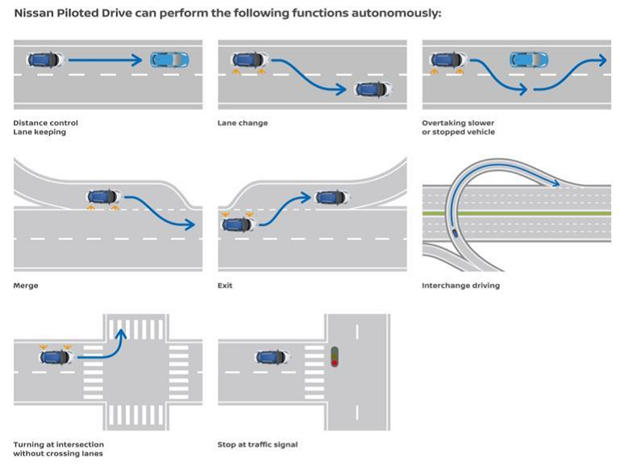 Para a primeira fase, a Nissan vai oferecer até ao final de 2016, no Japão, a Unidade Pilotada 1.0 que permite a condução autônoma segura em condições de tráfego pesado nas autoestradas. Para 2018, a empresa espera implementar um sistema de condução autônoma em pistas múltiplas que permita a mudança automática de faixas. Em 2020, uma nova tecnologia será introduzida e permitirá que os veículos viagem de forma independente por ruas e estradas urbanas, incluindo cruzamentos.
