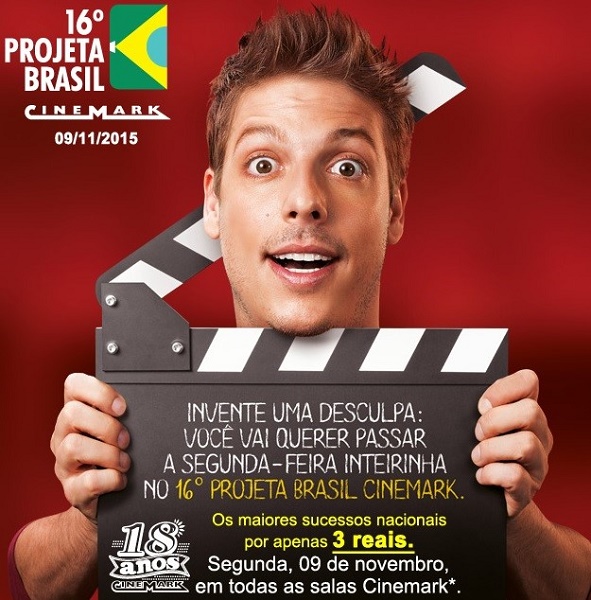 A Rede Cinemark reservou o dia 9 de novembro para a realização da 16ª edição do Projeta Brasil – dia inteiramente dedicado ao cinema nacional em mais de 570 salas espalhadas por 77 complexos da Rede no Brasil. O projeto pioneiro, criado pela Cinemark, tem o objetivo de incentivar a produção nacional, oferecendo aos espectadores uma programação de longas-metragens brasileiros lançados desde novembro de 2014. Os ingressos para todas as sessões do Projeta Brasil têm preço único de R$ 3, e a renda arrecadada é totalmente revertida para projetos e programas de incentivo à produção cinematográfica nacional.